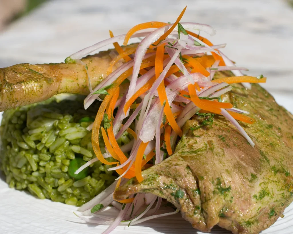 Este es el mejor arroz con pollo que he probado en mi vida, su color verde, dado por el cilantro y su aroma característico por la rica cerveza negra lo hacen inconfundible.