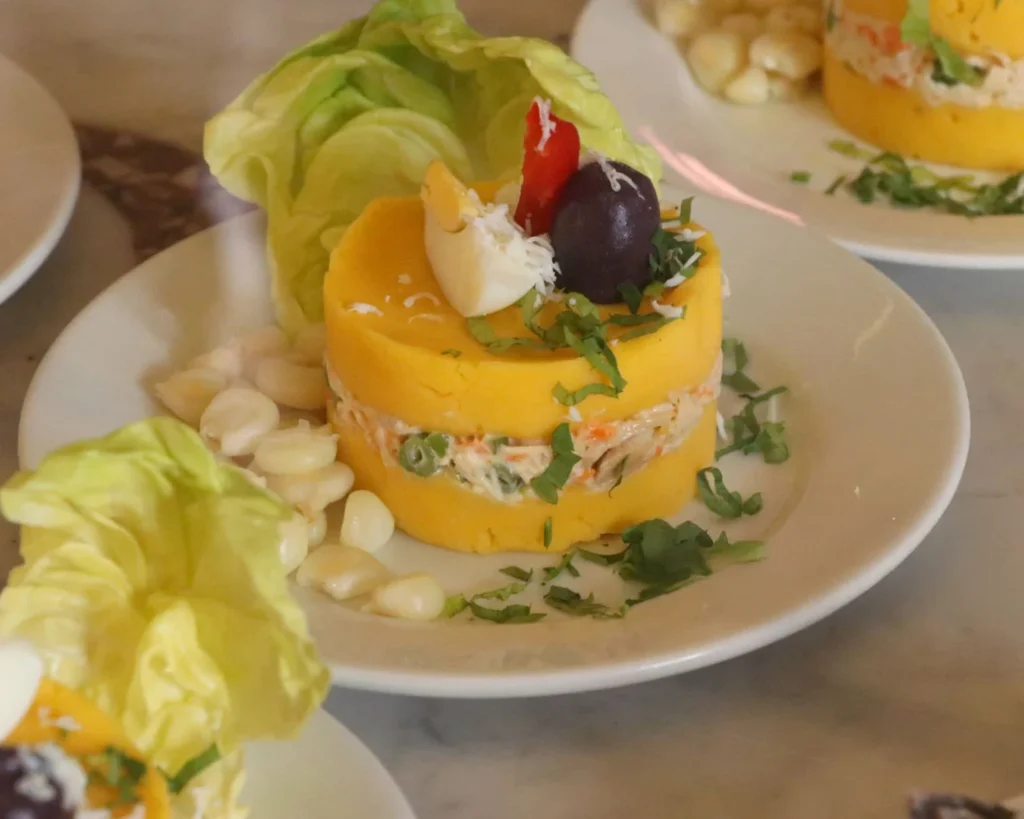 Elaborada con papa amarilla, limón y ají, funciona como base para distintos rellenos: pollo, atún, mariscos o vegetales. Su origen prehispánico se mezcla con técnicas posteriores, dando lugar a un plato fresco, adaptable y muy ligado a Lima.