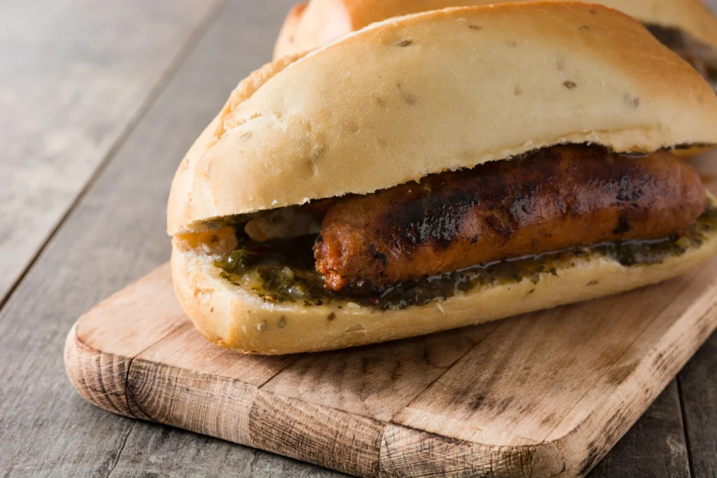 Chorizo a la parrilla dentro de pan, con chimichurri, se come rápido, de pie o al paso, y es uno de los sabores más típicos del país.